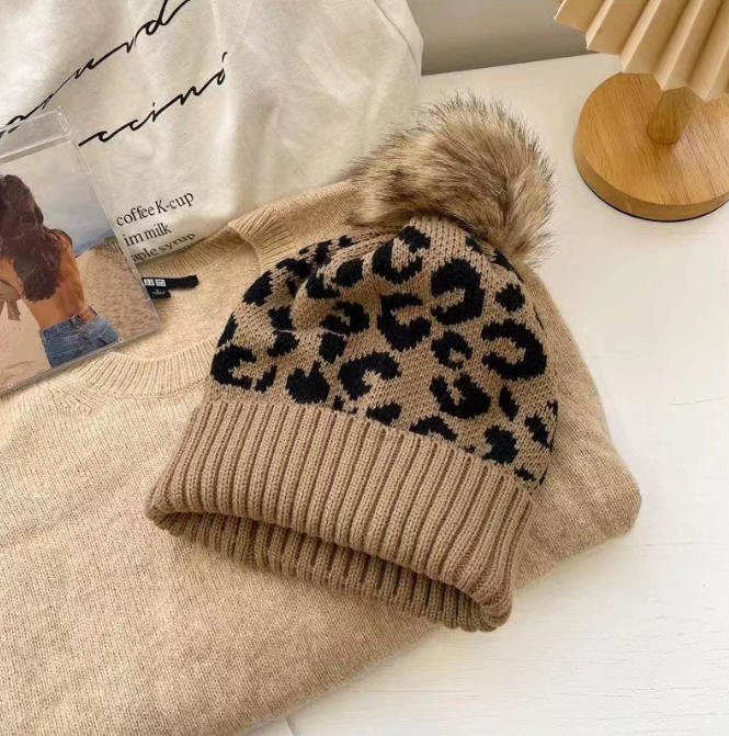 Bonnet femme léopard avec pompon en fausse fourrure – tricot doux – 3 couleurs