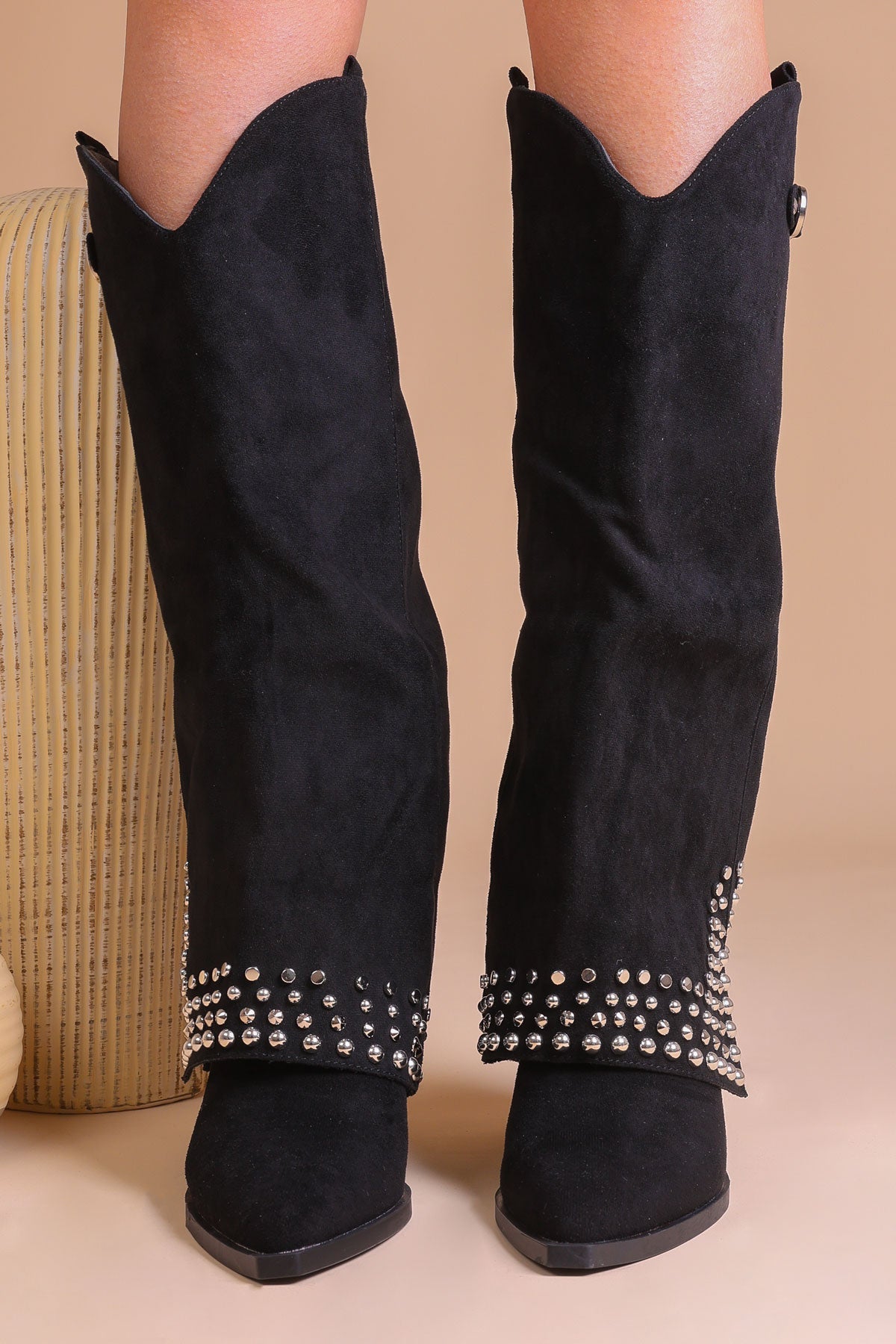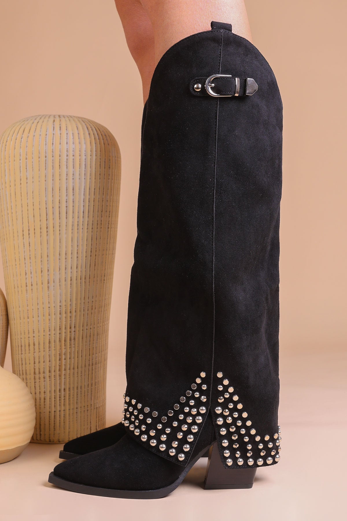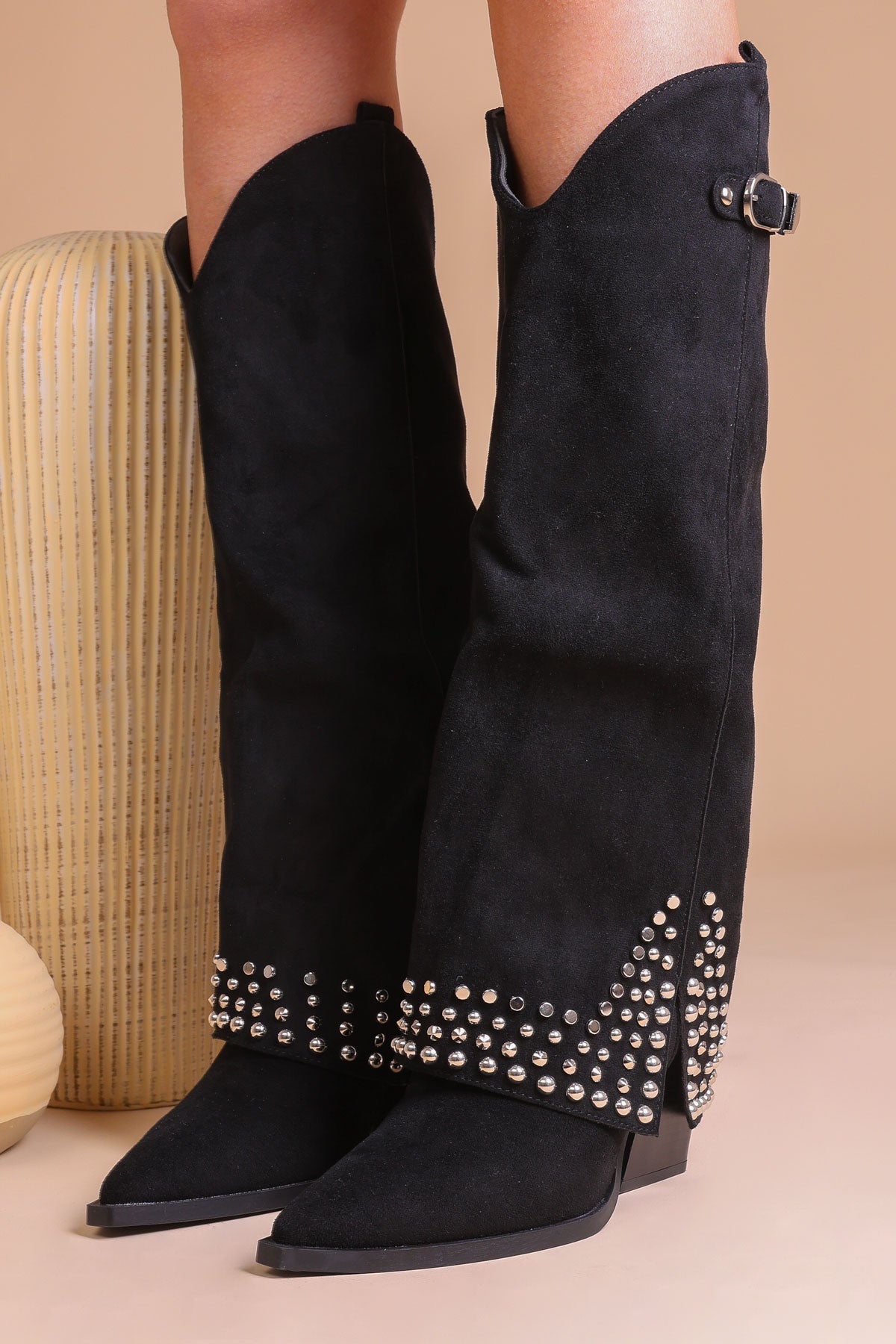 Bottes Hautes Femme Noires En Similicuir Avec Boucle Et Clous – Modèle Shark Tendance Pour La Saison Automne Hiver