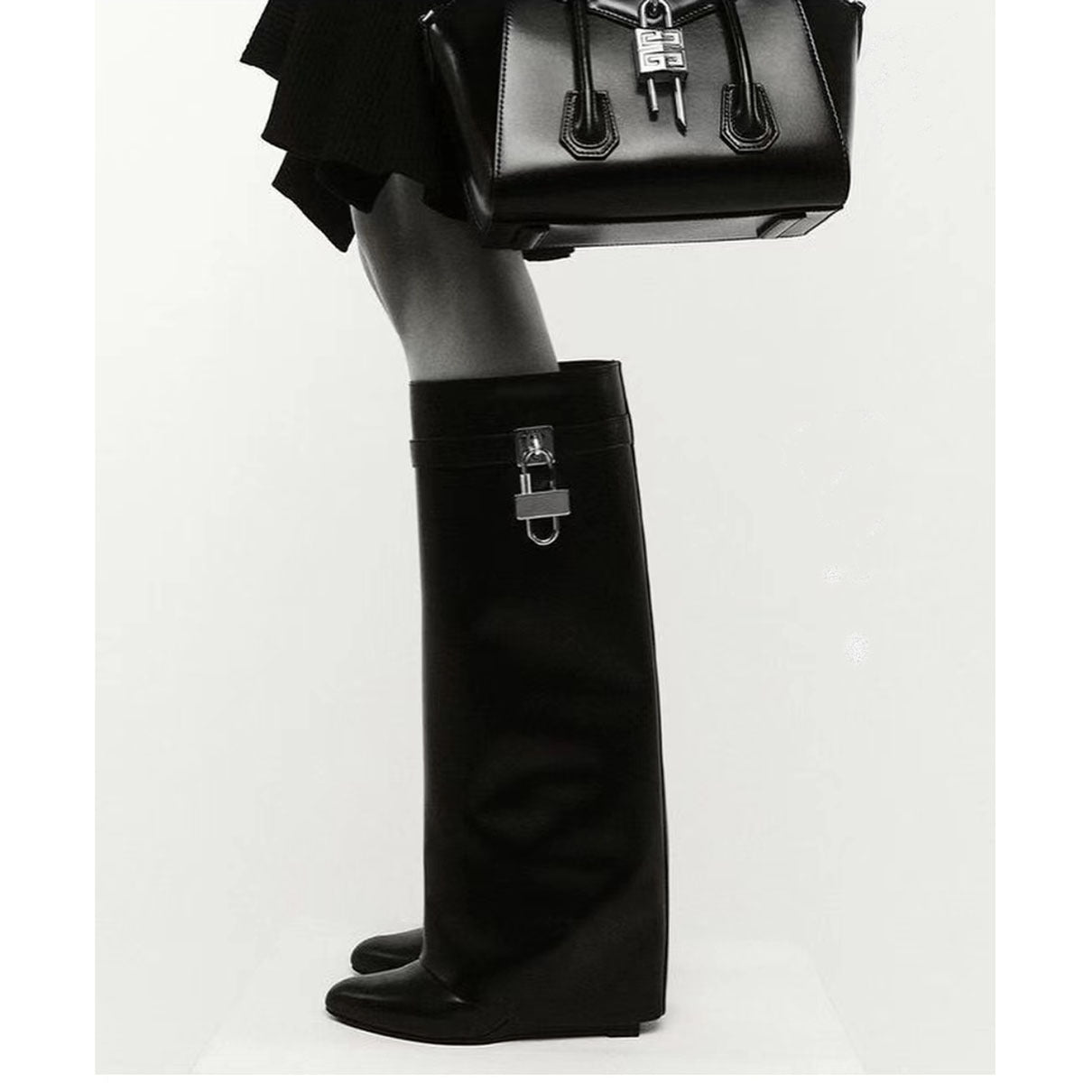 Bottes Hautes En Cuir Verni Ornées Avec Boucle Shark Lock Pour Femme – Chaussures Tendance Automne Hiver
