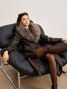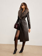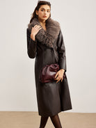 Manteau Long en Similicuir Marron | Col Fausse Fourrure Gris | Élégance Hivernale