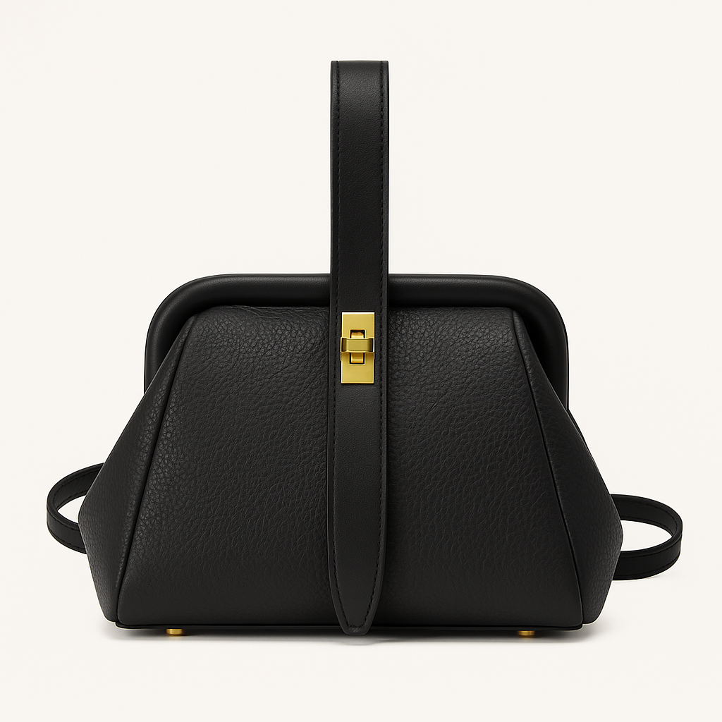 Ce sac à main géométrique en simili cuir grainé allie lignes angulaires et raffinement doré. Sa silhouette trapezoïdale unique et sa fermeture à sangle centrée lui confèrent un look moderne et sophistiqué, idéal pour les femmes en quête d’un accessoire qui sort de l’ordinaire.