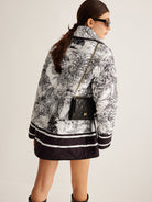 Cette veste kimono imprimée en noir et blanc est parfaite pour apporter une touche artistique et chic à votre garde-robe. Avec ses détails soigneusement travaillés et sa coupe fluide, elle est idéale pour un look élégant et audacieux.