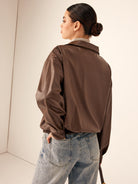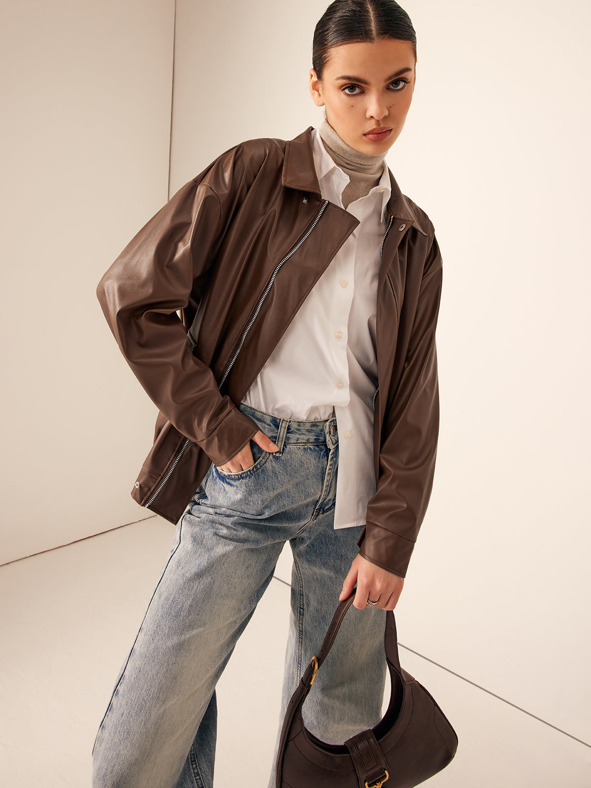 Cette veste marron en simili cuir offre une allure élégante et polyvalente. Conçue avec une coupe légèrement ample, elle est idéale pour les journées fraîches ou pour compléter vos tenues décontractées avec une touche sophistiquée.